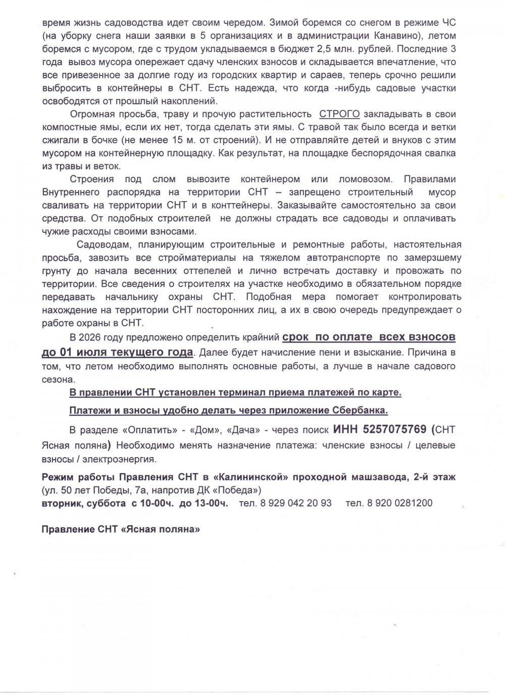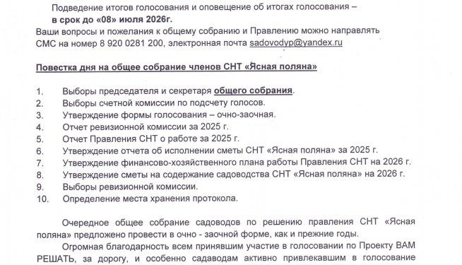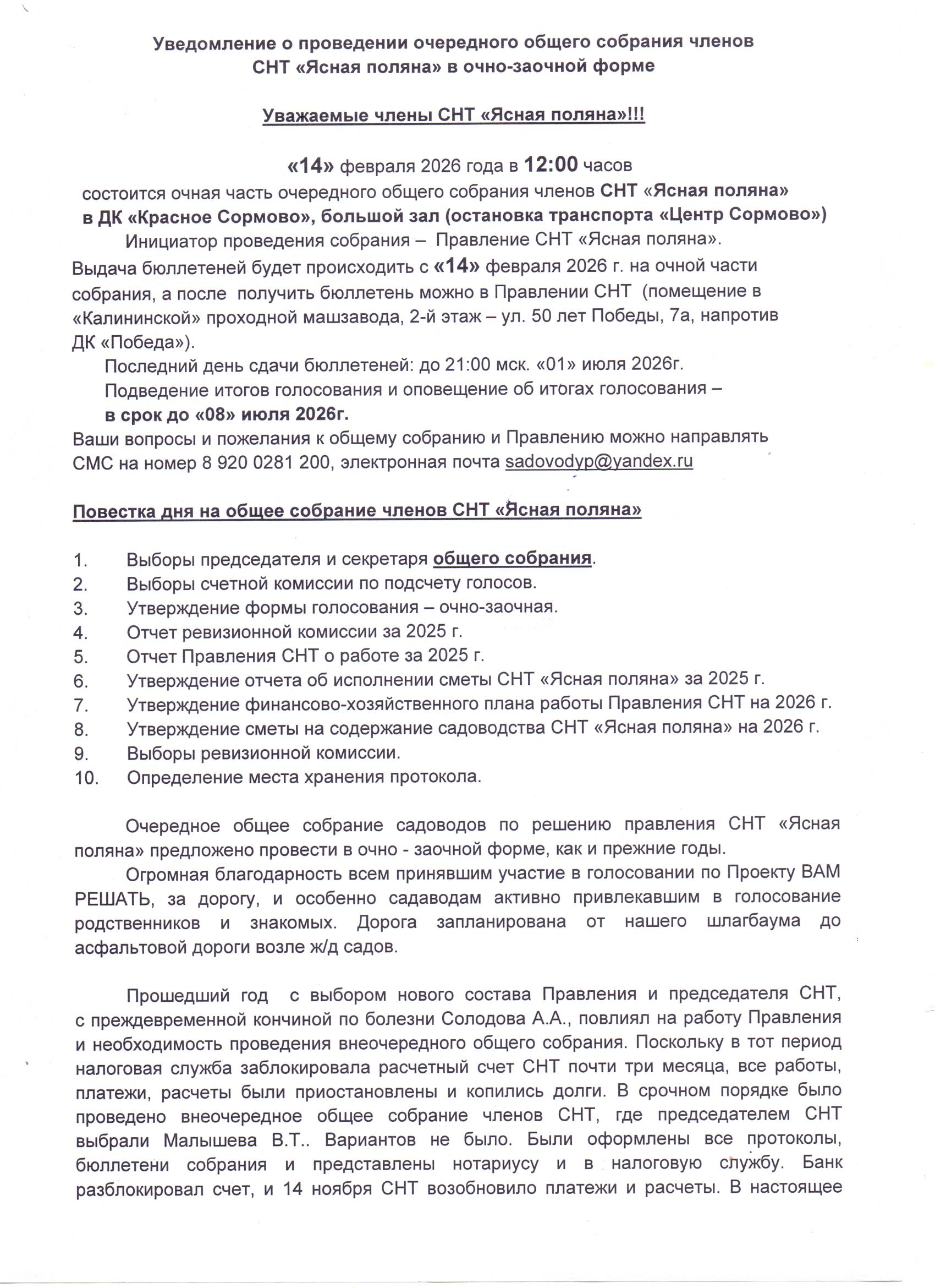 Объявление о проведении общего собрания членов СНТ "Ясная поляна" в очно заочно форме