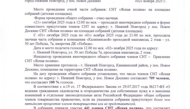 СНТ Ясная поляна Протокол от 02 ноября 2025