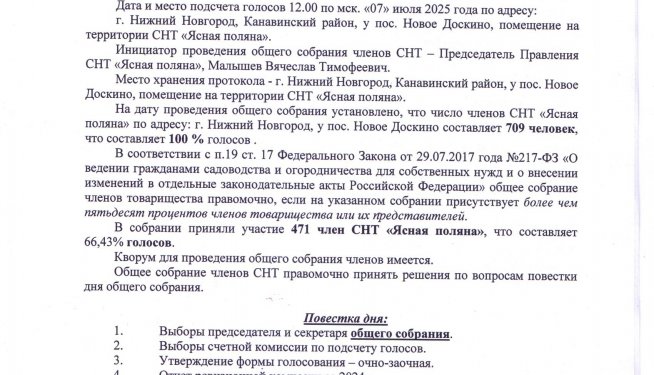 СНТ Ясная поляна Протокол от 07 июля 2025
